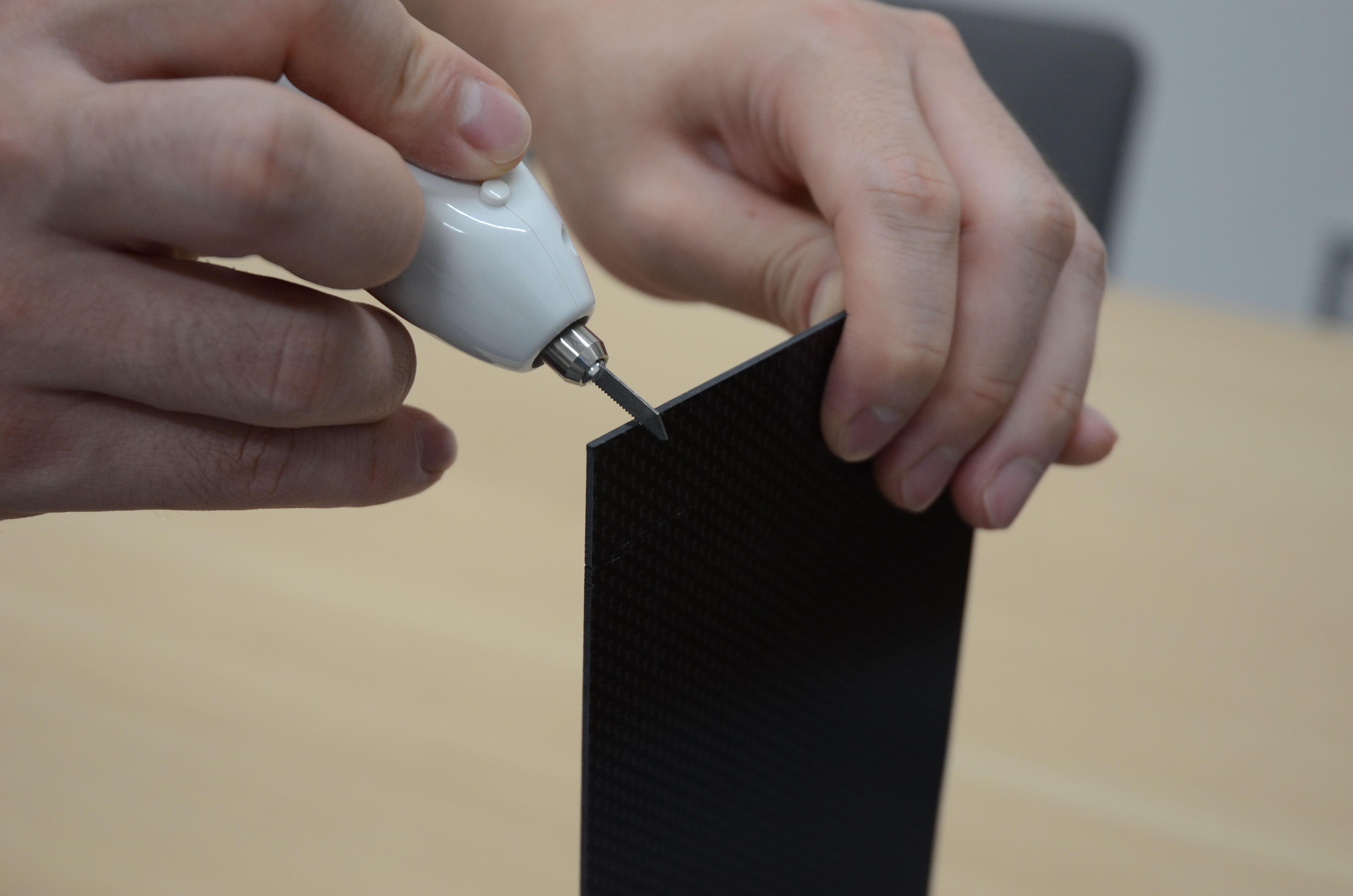 The saw blade is useful for cutting hard materials (carbon sheet, thin wood, thermosetting resin, etc.) that do not melt and cannot be cut perpendicularly with a regular blade. It wears out faster than other blades, so it is recommended to have a spare.